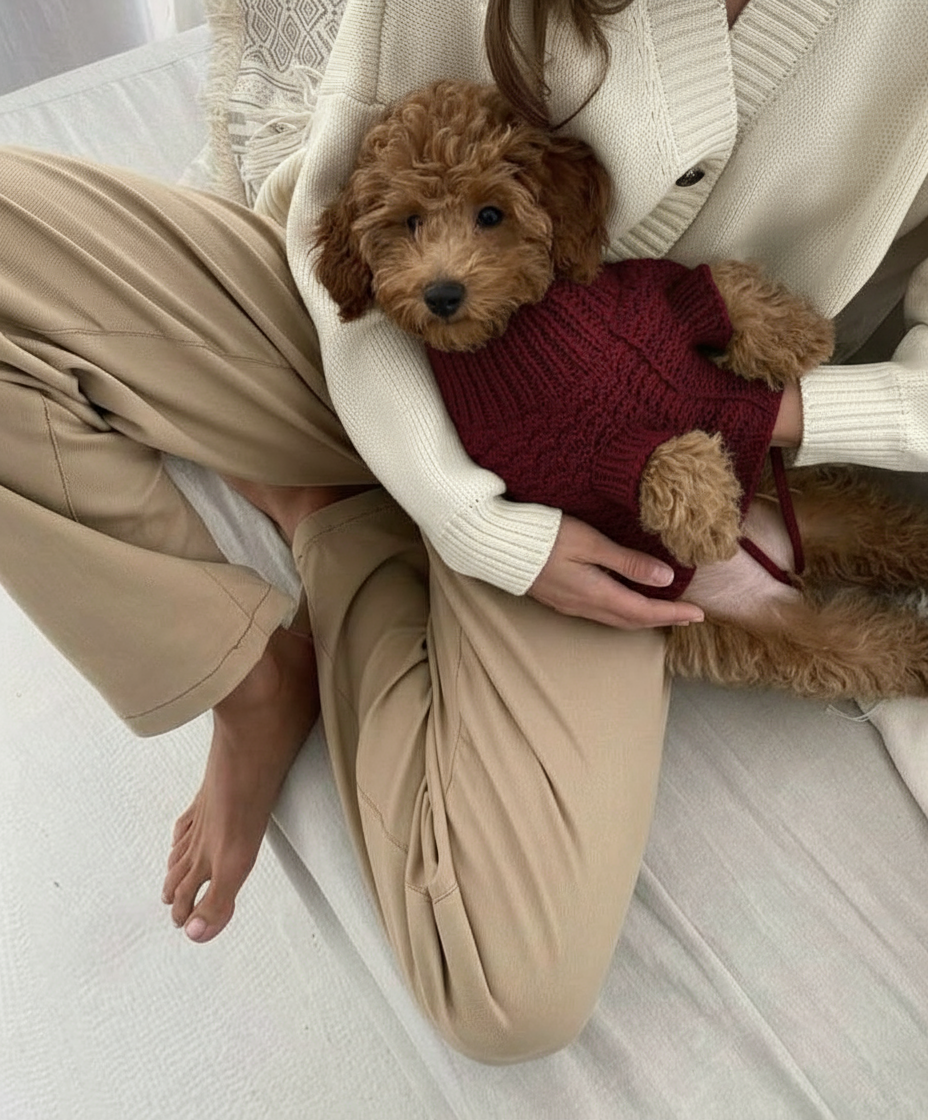 Weich, strukturiert und unendlich kuschelig - dieser Pullover ist der Inbegriff von Hundekomfort. Feines Zopfmuster mit geschmeidiger Baumwoll-Kaschmir-Textur wärmt, ohne zu beschweren. Ob beim Entspannen am Kaminfeuer oder beim Stadtbummel – Dein Hund sieht darin unglaublich niedlich aus und fühlt sich rundum wohl.